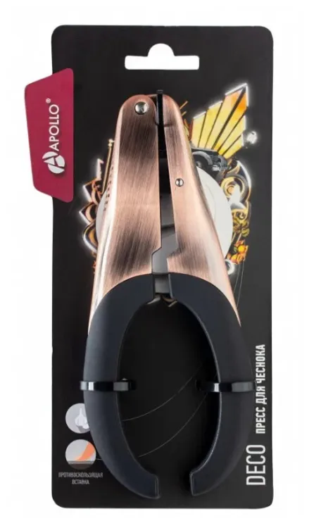 Пресс для чеснока Deco предназначен для измельчения чеснока. Специальная форма рукоятки и её мягкое приятное на ощупь покрытие не позволяют прессу выскальзывать из руки во время использования. Материалы изготовления: цинковый сплав с покрытием красной медью, ABS пластик с резиновым покрытием
