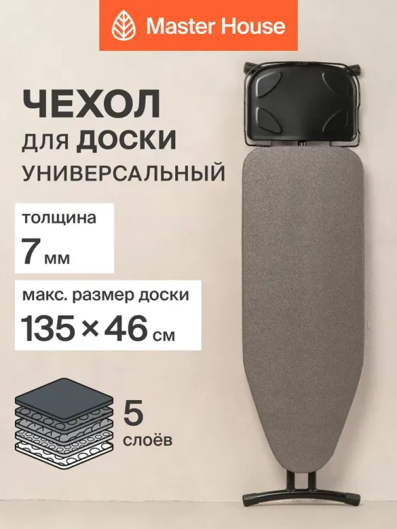 Чехол подходит для гладильных досок с рабочей поверхностью: 130-135см х 38-46см.