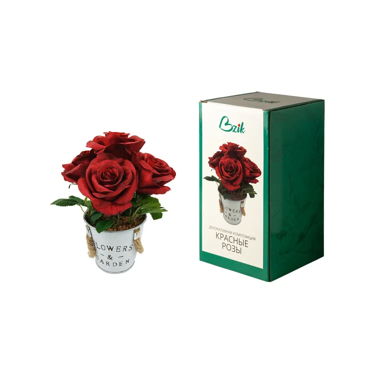 Декоративная композиция "Красные розы" - это уникальное украшение, которое привнесет в ваш интерьер нотку романтики и стиля. Искусственные цветы в металлическом горшке создают неповторимый акцент и придают помещению особый шарм.