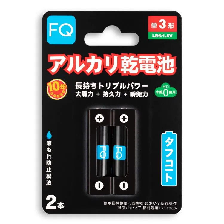 Вид батарейки: Щелочная Форм-фактор: AA (LR6) Напряжение: 1.5 V Высота: 50,5 мм Вес: 11 г Универсальные щелочные батарейки FQ – надежный источник питания для часто используемых устройств, нуждающихся в увеличенной мощности батареи. В отличие от стандартных солевых батареек, они обладают значительным запасом электроэнергии и низким уровнем саморазряда, что позволит хранить их вне устройства гораздо дольше. Внимание! Батарейки FQ не подлежат подзарядке.
