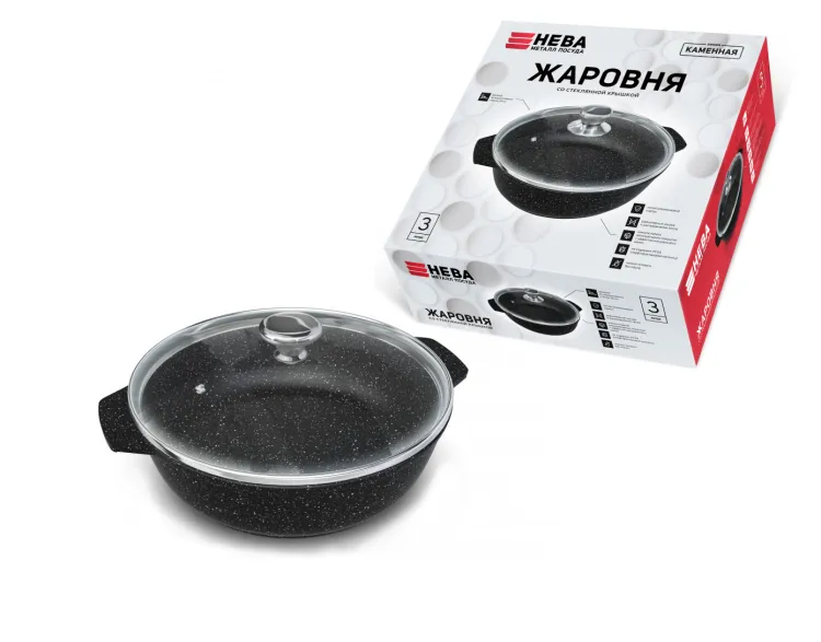 "Каменная" Чёрный гранит" Жаровня 26см, h 7,8см 3л со стекл. крышкой