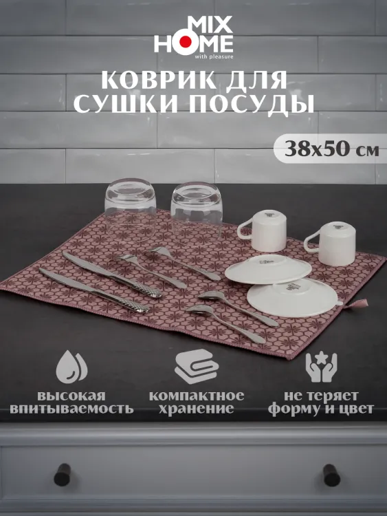 Быстросохнущий материал позволяет эффективно сушить посуду, предотвращая образование влаги и неприятных запахов. Нескользящая поверхность гарантирует устойчивость коврика на столе, что обеспечивает безопасность и комфорт при использовании.