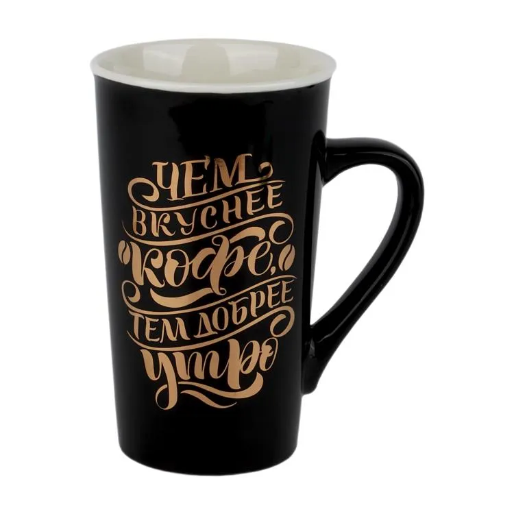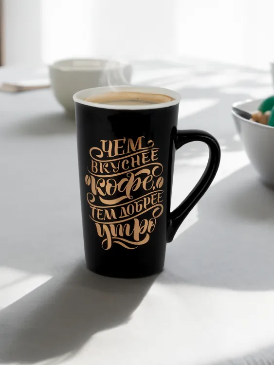 Представьте себе начало дня с чашечки ароматного кофе, согревающего не только тело, но и душу. Именно для таких моментов и создана наша кружка. Высокая и узкая, с изящными линиями, она станет настоящим украшением вашего стола. Глянцевая черная поверхность придает ей особый шик, а золотая надпись "Чем вкуснее кофе, тем добрее утро" добавляет нотку позитива.
