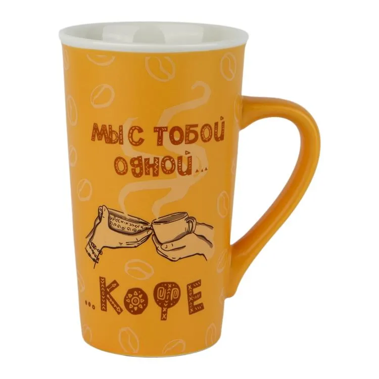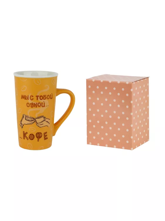 Необычная высокая и узкая форма подчеркивает изящество кружки, а оранжевый цвет и надпись "Мы с тобой одной кружки кофе" придают ей особый шарм. Эргономичная ручка обеспечивает комфортный хват, а матовая поверхность приятна на ощупь. Благодаря своим свойствам, фарфор долго сохраняет температуру напитка, позволяя вам насладиться каждым глотком.