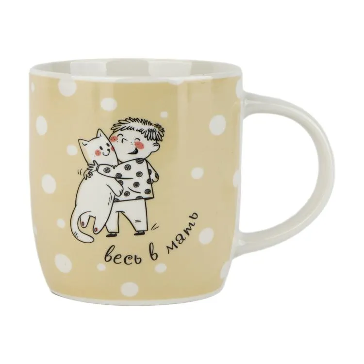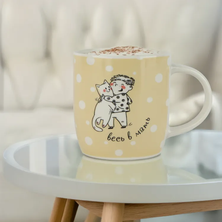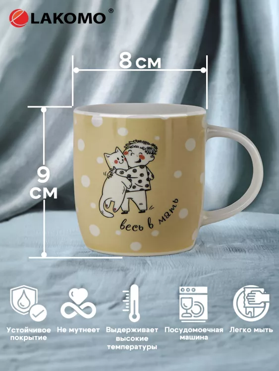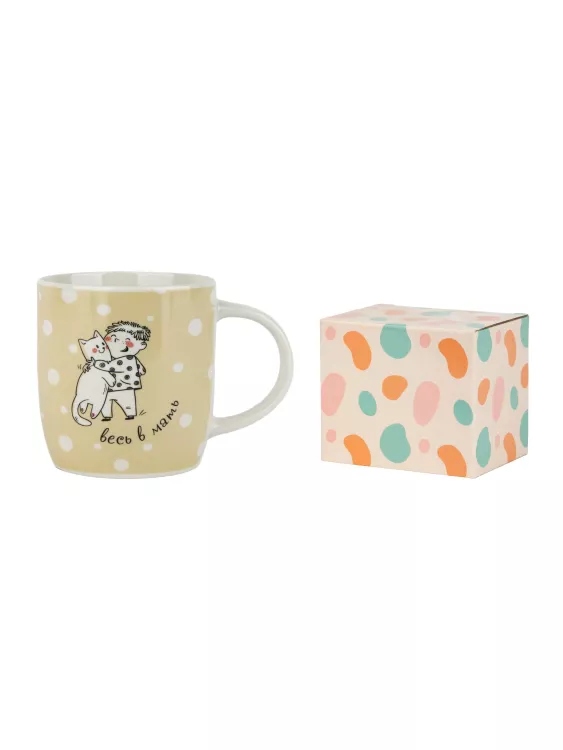 Стильная кружка станет изюминкой вашей кухни или оригинальным презентом для близких. Изготовленная из высококачественного фарфора, она сочетает в себе классическую элегантность и современный дизайн. Белая поверхность кружки подчеркивает изысканность надписи "Весь в мать", которая добавит нотку юмора и тепла, а принт в горох добавит игривости в каждое чаепитие