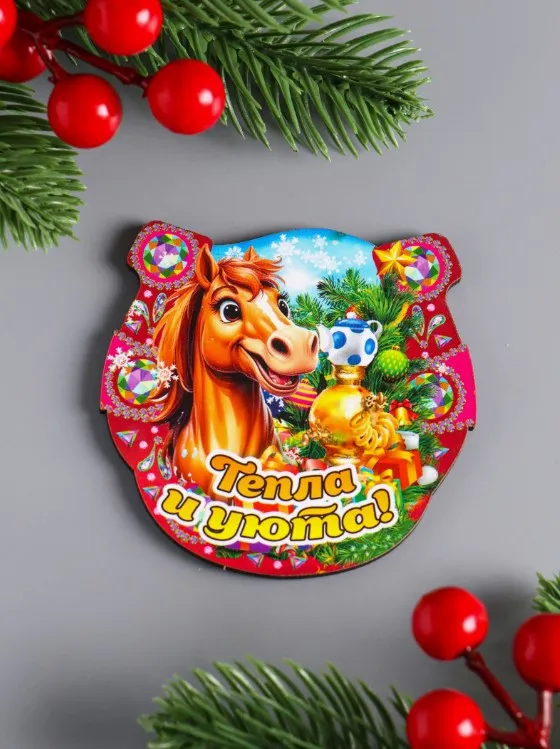 Магнит "Новогодняя подкова с конём. Тепла и уюта" 7х7см