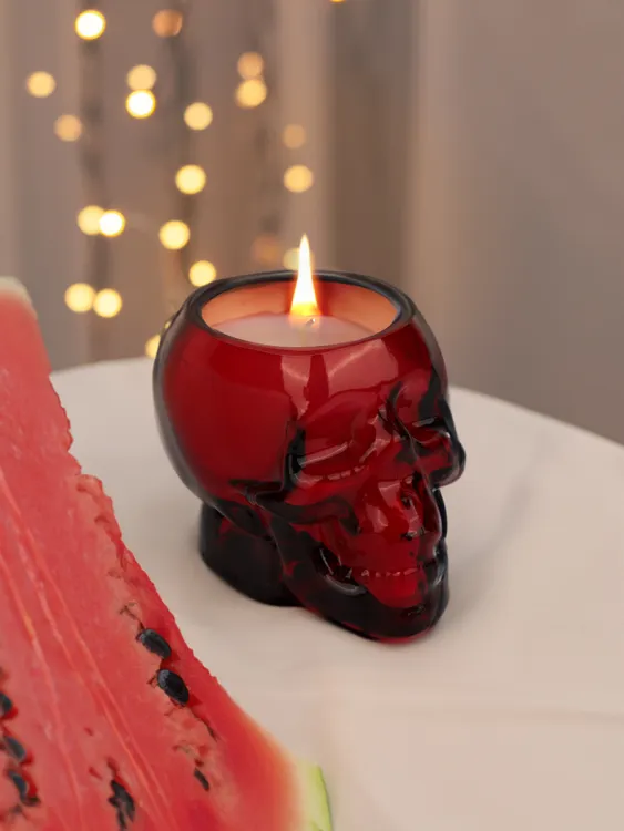 Свеча из соевого воска помещена в стильный стакан в виде черепа, который призван усилить эстетическое наслаждение - на солнце стекло играет благодаря уникальной форме, добавляя тепла и уюта в интерьер. Сладкий аромат арбуза мягко рассеивается в воздухе, создавая приятную и расслабляющую обстановку.