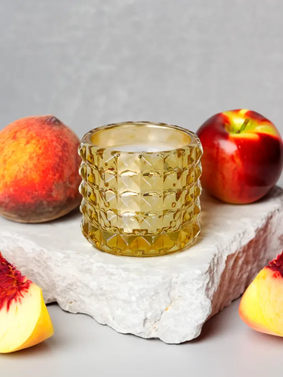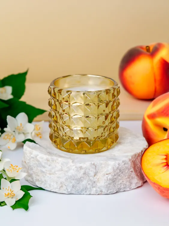Свеча из соевого воска помещена в стильный стакане, который призван усилить эстетическое наслаждение - на солнце стекло играет благодаря уникальному рельефу, добавляя тепла и уюта в интерьер. Парфюмированный аромат мягко рассеивается в воздухе, создавая приятную и расслабляющую обстановку.