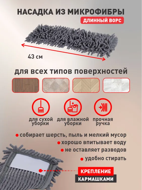 Эта насадка легко крепится к любой стандартной швабре, обеспечивая надежную фиксацию в процессе уборки. Ее размеры — 43 на 13 сантиметров — позволяют быстро и эффективно очищать как большие поверхности, так и труднодоступные места. Насадка выдерживает многократные стирки в машинке, не теряя своих свойств, что значительно увеличивает срок ее службы. Она также быстро сохнет, не оставляя неприятных запахов.