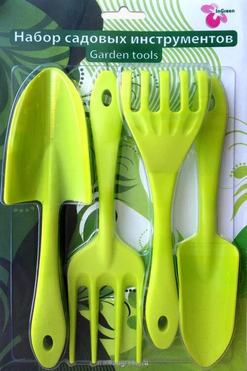 Материал: полипропилен. Набор включает в себя: совок для пересадки, вилку для рыхления, лопатку и грабельки.