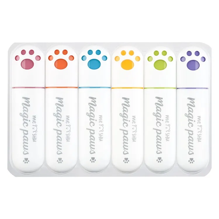 Текстовыделители с вырубкой в форме милой лапки и забавными надписями созданы поднимать настроение на работе или учёбе. Цвет лапки на колпачке соответствует цвету чернил. Текстовыделители упакованы в ПВХ-бокс с европодвесом по 6 шт.