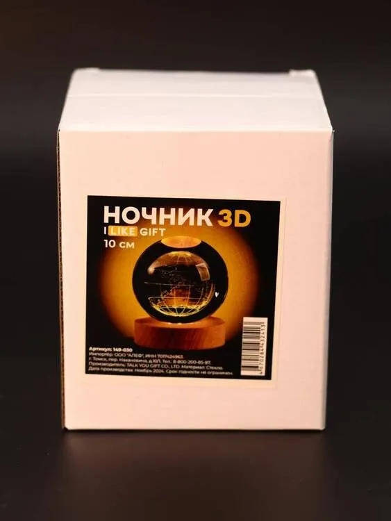 Миниатюрный 3D ночник (диаметр шара 10 см, высота основания 2 см) станет украшением любого интерьера. Он создает мягкий рассеянный свет, не раздражает глаза и способствует расслаблению перед сном. Размер: 12 х 10 х 10 см.