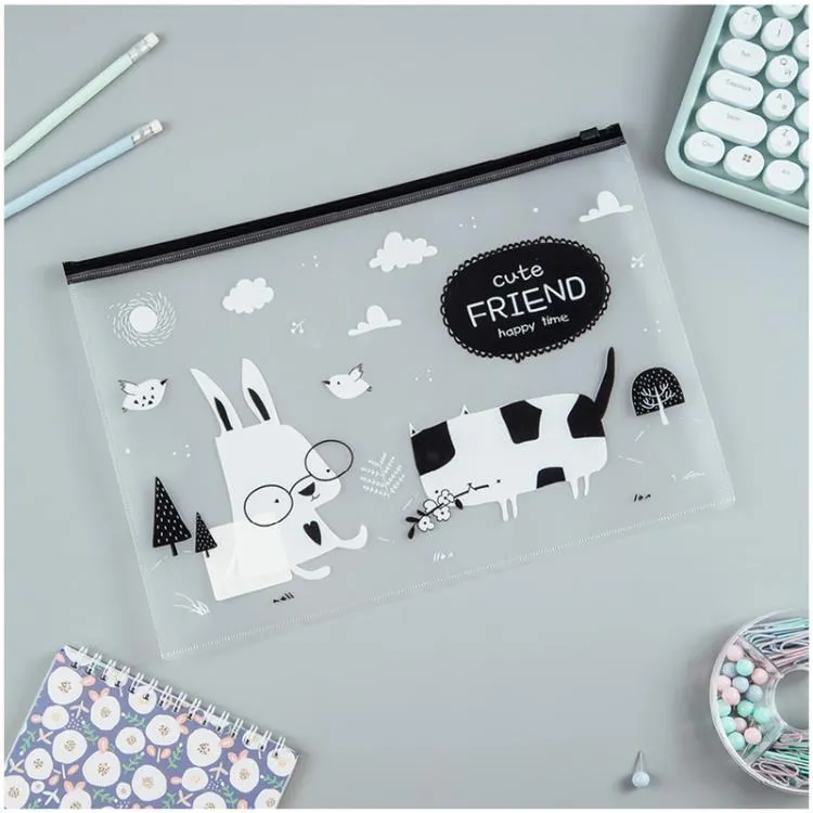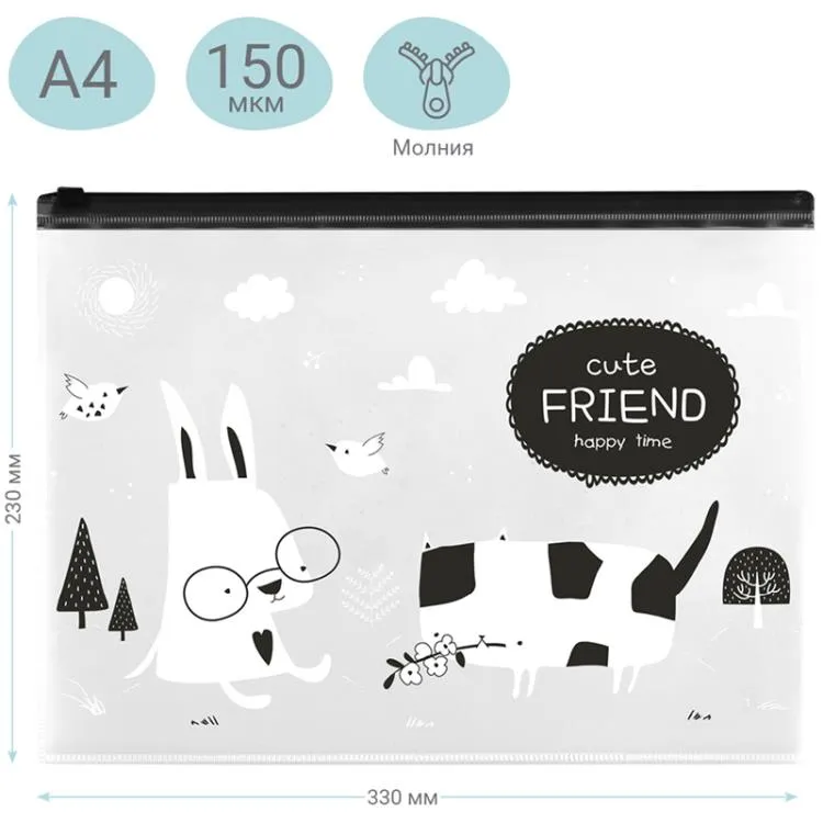 Папка-конверт на молнии MESHU Cute Friend – стильный помощник, который подойдет для хранения тетрадей, блокнотов, ежедневников форматов А4 и А5. Папка формата А4 вмещает до 60 листов стандартной офисной бумаги. Изготовлена из прочного полипропилена толщиной 150 мкм с гладкой фактурой. Размер горизонтальной папки – 330*230 мм. Папка имеет герметичную застежку-зиплок чёрного цвета, которая защищает документы от механических повреждений, пыли и влаги. Милый и стильный чёрно-белый рисунок с животными понравится всем любителям современных дизайнов.