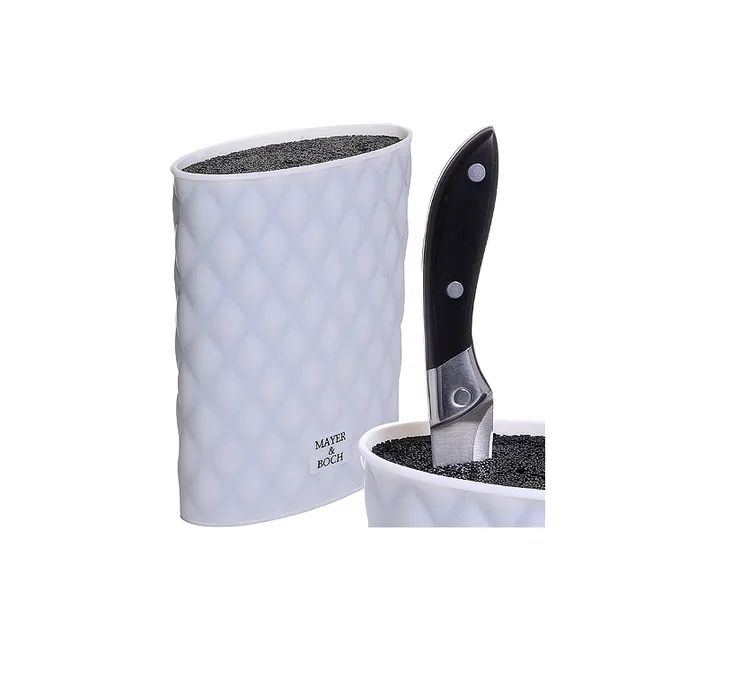 Универсальная подставка MAYER&BOCH позволит хранить ножи и ножницы любой формы, вне зависимости от их размера и лезвия. Корпус подставки выполнен из пластика, что делает ее гигиеничной и долговечной, а уникальный внутренний наполнитель состоит из тонких и гибких полипропиленовых стержней, которые легко моются. Полипропиленовые стержни наполнителя формируют структуру, подобную щетке, поэтому достаточно просто воткнуть нож в подставку, и она надежно удержит его. Подставка отвечает всем нормам гигиенических требований, так как при необходимости наполнитель свободно вынимается и моется в посудомоечной машине. Полипропилен является экологически чистым материалом, устойчивым к истиранию, высокой температуре и химическому воздействию. Подставка для ножей MAYER&BOCH станет прекрасным подарком, а ее яркий дизайн станет украшением Вашей кухни. Подходит для мытья в посудомоечной машине.