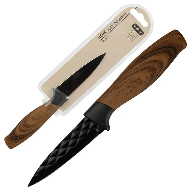 Нож для овощей Длина лезвия: 8,9 см. Толщина стали: 1,2 мм. Пластиковая рукоятка "под дерево" с покрытием софт-тач. Фактурное лезвие с покрытием non-stick. Материал: нержавеющая сталь 2CR14, полипропилен.