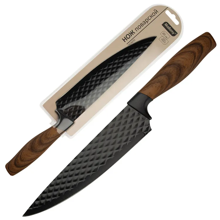 Нож поварской Длина лезвия: 20 см. Толщина стали: 1,5 мм. Пластиковая рукоятка "под дерево" с покрытием софт-тач. Фактурное лезвие с покрытием non-stick. Материал: нержавеющая сталь 2CR14, полипропилен.