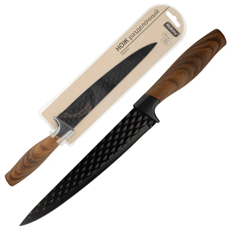 Нож универсальный Длина лезвия: 12,7 см. Толщина стали: 1,2 мм. Пластиковая рукоятка "под дерево" с покрытием софт-тач. Фактурное лезвие с покрытием non-stick. Материал: нержавеющая сталь 2CR14, полипропилен.